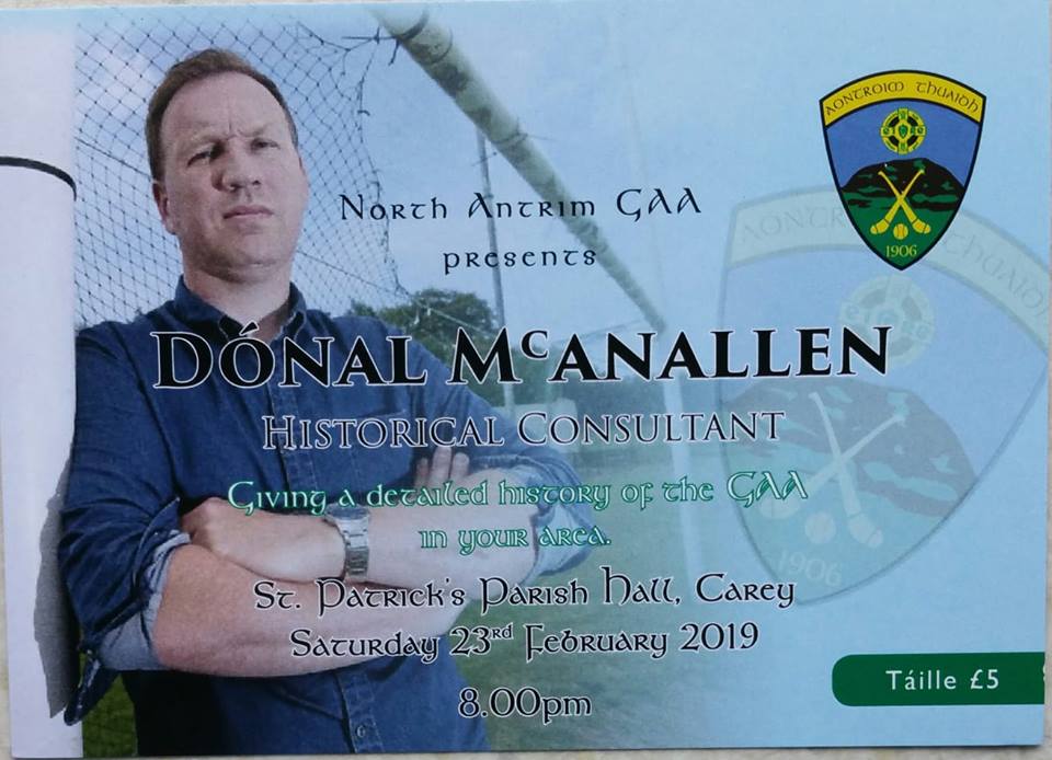 The next North Antrim Cultural Event following on from Last years talk by Eamon Phoenix, Dónal McAnallen will cover the history of the GAA in North Antrim. It will be in Carey Parish Hall Sat 23rd February 8pm