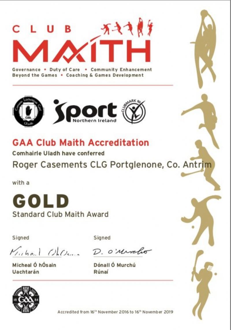 ROGER CASEMENT GAC STRIKE CLUB MAITH GOLD It is with great pride we inform club members of the communication received today by club Runai (secretary) Martin Kearney of the official Club Maith accreditation….and its GOLD! Martin received the fantastic news earlier today in an email from Ulster Club and Community Development Officer Fionntan O Dowd. "A Chairde, - I am pleas...