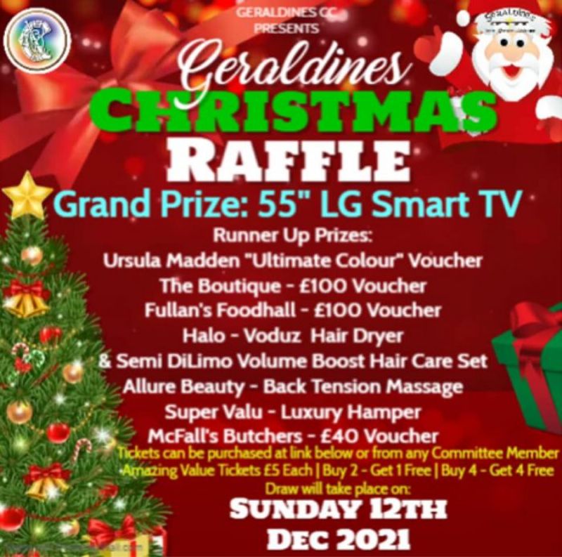 Geraldines Christmas raffle Tickets £5 each. Buy 2 get one free. Buy 4 get four free. Free tickets are added separately. Limited Quantity Available! Cost per item £5 You can purchase tickets at this link https://www.klubfunder.com/Clubs/Geraldines_Camogie_Club_Portglenone/Events/Geraldines_Christmas_Raffle?fbclid=IwAR0Yiaz9RgBQGbiRJsDeXCkHYRwlvyVOpHlUBhAdvlp7U1DZhiW_...